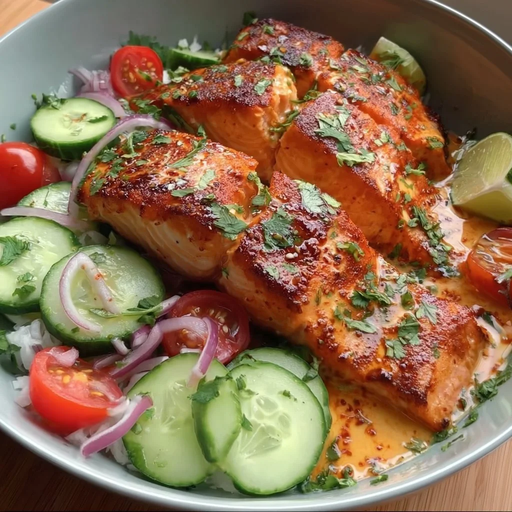Pro Tip: The finished plate should show vibrant green cilantro, glossy sauce on salmon, and the salad’s bright juices pooling slightly beneath the fish.