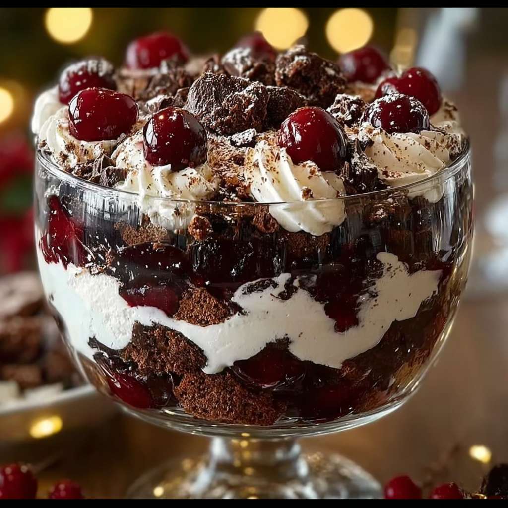 Black Forest Trifle is a delightful dessert perfect for Christmas. It combines rich chocolate cake, creamy whipped cream, and sweet cherries to create a beautiful and tasty treat. This simple recipe is easy to assemble and is sure to impress your family and friends during the holiday season.