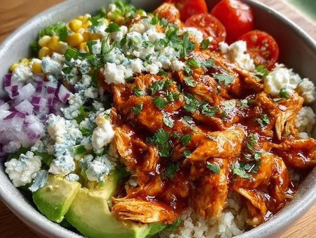 - Top each bowl with sliced chicken, avocado, blue cheese, and a drizzle of buffalo sauce.