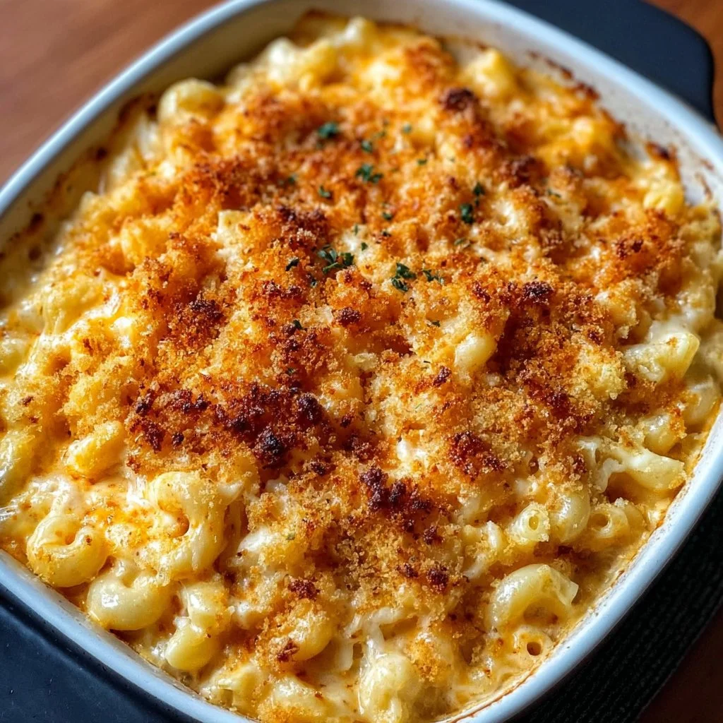 Transfer the mac and cheese to a baking dish and evenly scatter the breadcrumbs over the top.