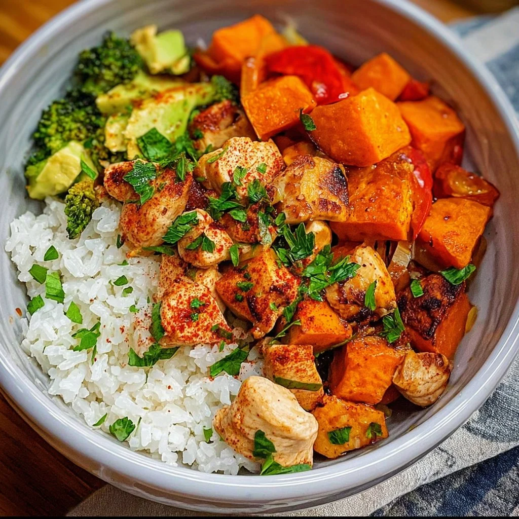 - Assemble bowls: rice, roasted sweet potatoes, chicken, vegetables, and fresh herbs.