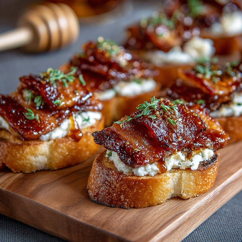 Candied bacon layered over a creamy cheese base creates the ultimate sweet-and-savory treat. These crostini glisten under the lights and taste just as indulgent as they look — a perfect choice for cocktail parties.