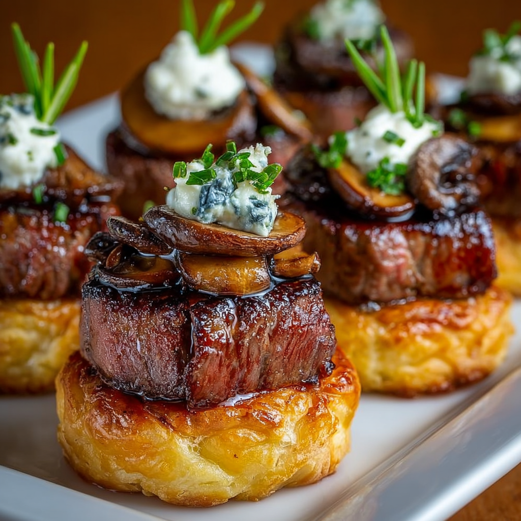 These elegant steak crostini deliver restaurant-quality flavor in bite-sized form. Tender slices of seared beef rest on crisp toasted baguette rounds spread with a tangy horseradish cream. A topping of slow-caramelized onions adds deep sweetness that perfectly balances the heat of the sauce. Each mouthful feels luxurious yet approachable — a holiday appetizer that turns simple ingredients into pure indulgence.