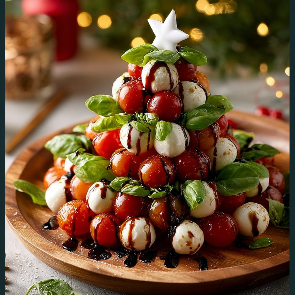 - Arrange the mozzarella balls and cherry tomatoes in a triangle shape on a platter to resemble a Christmas tree.