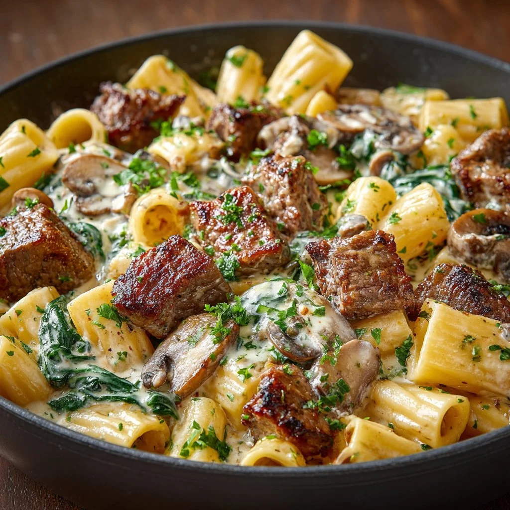 After a short rest, nestle steak cubes back into the sauced pasta and warm through for 1–2 minutes. Finish with 2 tbsp chopped fresh parsley for color and a fresh herb lift.