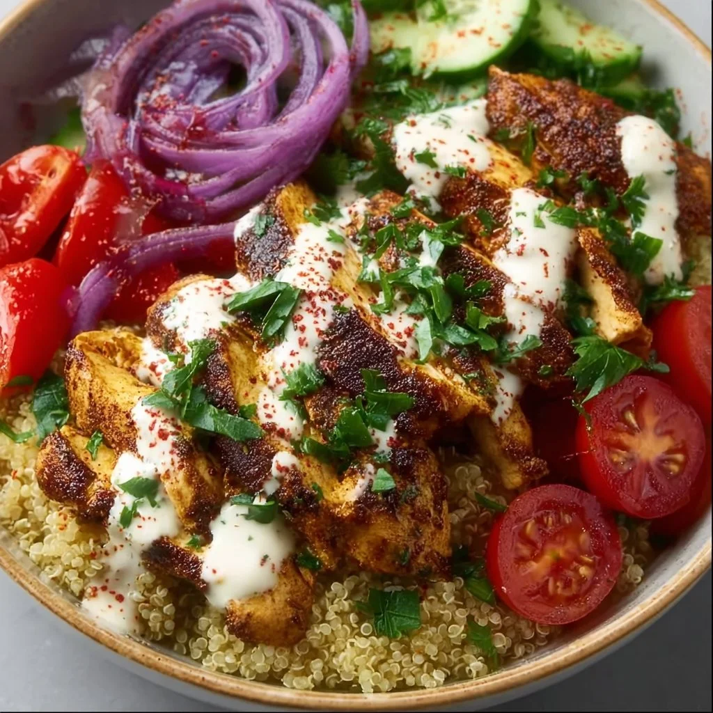 Pro Tip: Visual cue — bowls should show layered contrast: pale quinoa, golden-spiced chicken, colorful vegetables, and a creamy white drizzle of tahini.