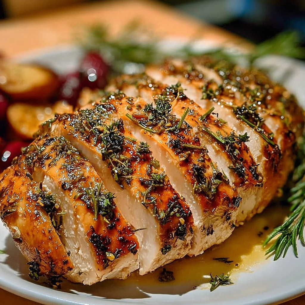 Carve and Serve: After resting, transfer the turkey breast to a cutting board. If you used a bone-in breast, carve the meat off the bone. For both bone-in and boneless breasts, slice the turkey against the grain for maximum tenderness. Arrange the slices on a serving platter and garnish with fresh herbs, if desired. Serve immediately and enjoy your perfectly roasted herb butter turkey breast! Don’t forget to scrape up any pan drippings for extra flavor to spoon over the turkey or use as a base for gravy.