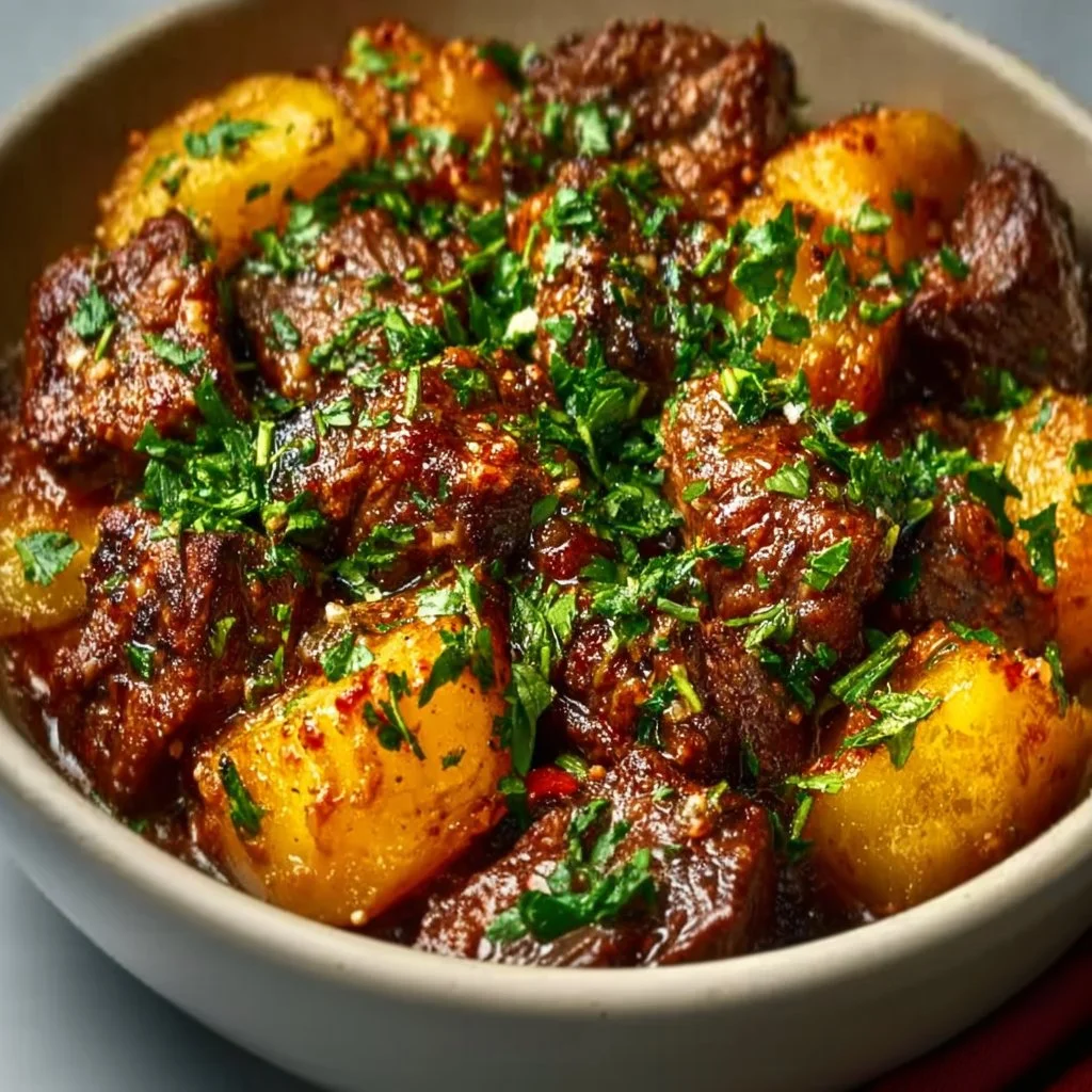 The texture here is everything: the stew meat breaks down into tender, forkable bites while the potatoes soak up the garlicky butter so each bite is silky and savory. The sauce clings to meat and spuds without being heavy, and the Worcestershire adds a subtle umami backbone that makes this feel more complex than its ingredient list suggests.