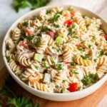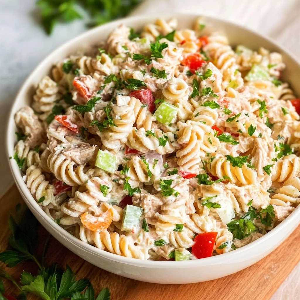 Start by cooking pasta until just al dente so it holds up in the dressing. Flake and drain the tuna well so the salad isn’t watery. Whisk Greek yogurt with lemon to create a bright, creamy dressing that won’t overpower the tuna. Fold in crunchy vegetables for texture, season to taste, and chill so flavors marry. The whole workflow is simple: cook pasta → mix dressing → combine → chill → serve.