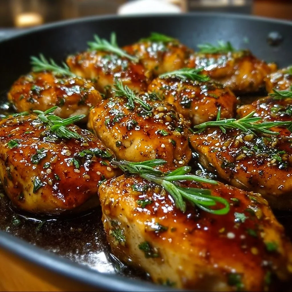 Pour the reserved honey-garlic mixture over the chicken in the skillet.
