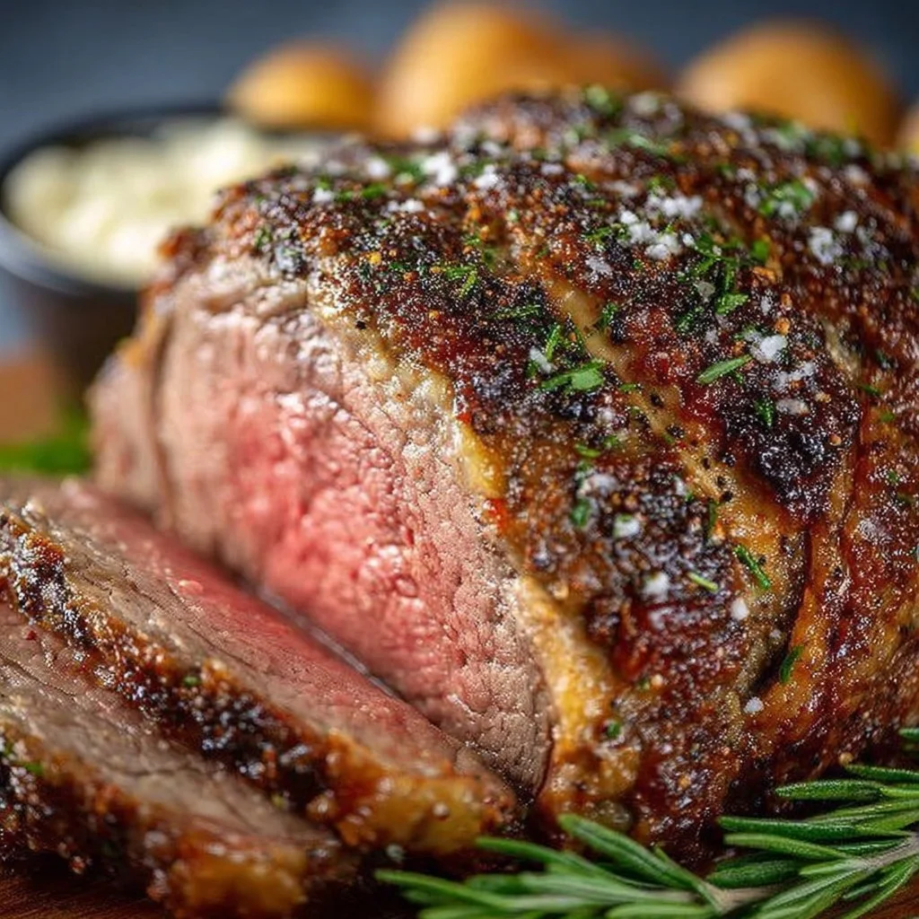 Serve the prime rib roast with classic sides like mashed potatoes, gravy, roasted vegetables, or a fresh salad. You can add horseradish or a rich au jus for dipping. Arrange the slices neatly on a platter and garnish with fresh herbs for added color and presentation.