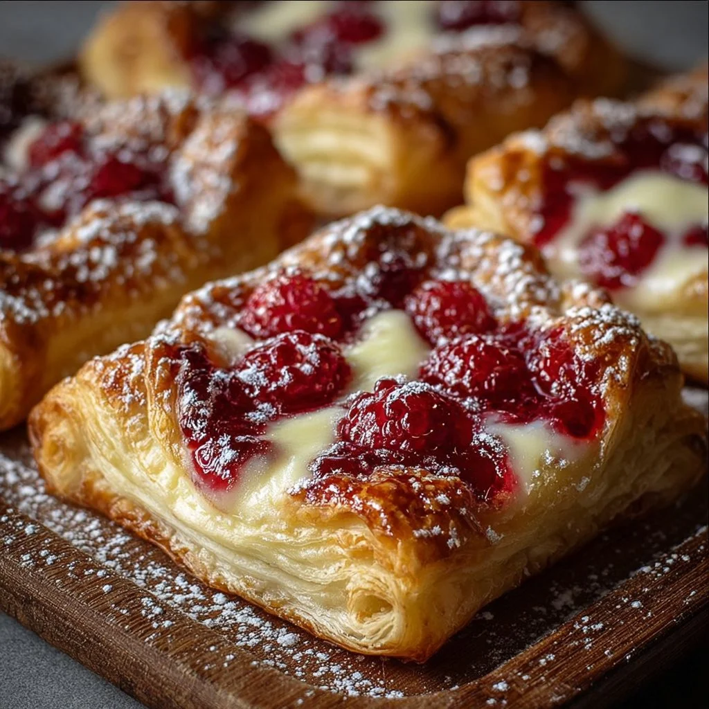 The texture is what sells these Danish pastries: the puff pastry puffs into crisp, flaky layers on the outside while the cream cheese center stays silky, slightly tangy, and custard-like after baking. The raspberry jam adds bright acidity and a jammy ribbon through the filling, creating contrast in every bite. Warm from the oven they’re tender and airy; cooled, the filling firms but remains creamy.