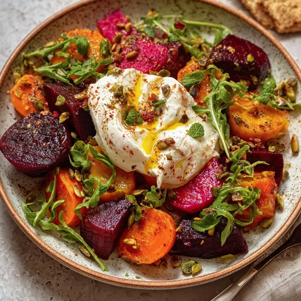 Roasted Beets and Carrots with Burrata hits a sweet-and-savory sweet spot. The natural sugars in beets and carrots concentrate as they roast, turning otherwise humble produce into rich, almost jammy bites. Burrata’s soft center contrasts the roasted texture, making each forkful interesting. This salad is fast, vegetarian-friendly, and looks restaurant-ready with minimal effort—perfect for weeknights, casual dinner parties, or holiday spreads.