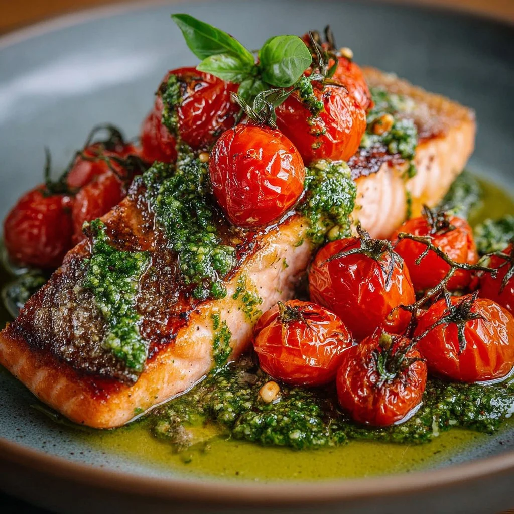 - Texture contrast: crisp skin, flaky fish, creamy pesto, and juicy tomatoes.