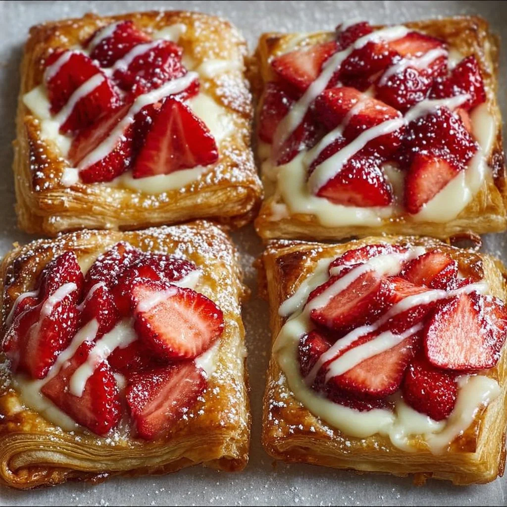 They are one-sheet puff pastry miracles: flaky edges, tangy cream cheese, and bright strawberries in every bite.