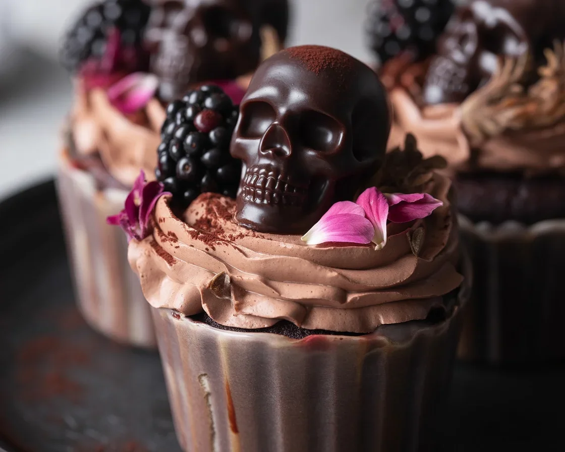 The buttercream on top? Fluffy, dreamy, holds whatever decoration you throw at it. I’ll show you how to make stand-out chocolate skulls. But if that sounds too much, you can always use sprinkles, fake bones, whatever. They’ll still look like you worked way harder than you did.